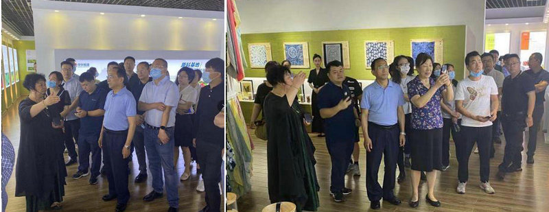 在天然植物印染展廳,五彩斑斕的產品展示,引得參觀人員的濃厚興趣。文總饒有風趣的介紹,嘉賓神情專注的觀看。